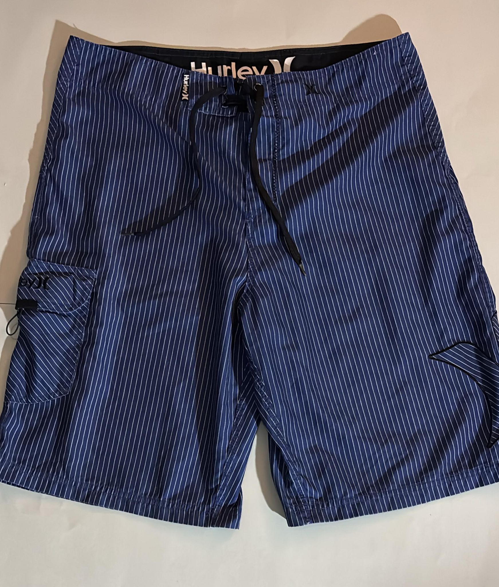 Color: Azul marino con un patrón clásico de rayas verticales en color blanco/celeste.