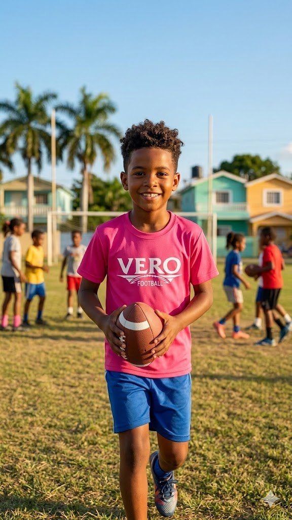 • Diseño: Gráfico central en color blanco con el texto “VERO FOOTBALL” acompañado de un logotipo estilizado de un balón de fútbol americano.